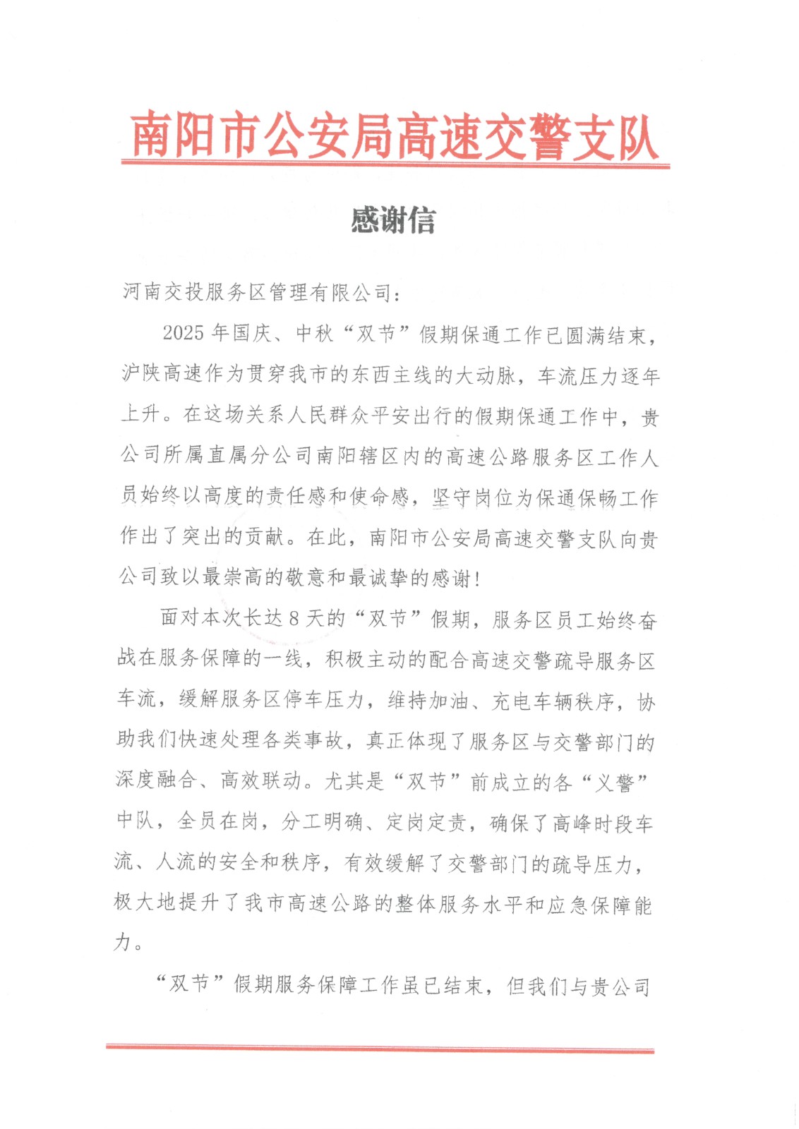 《一封感謝信 濃濃服務(wù)…》 10月10日,南陽市公安局高速交警支隊(duì)向公司所屬直屬分公司寄來感謝信,表達(dá)對南陽轄區(qū)內(nèi)…